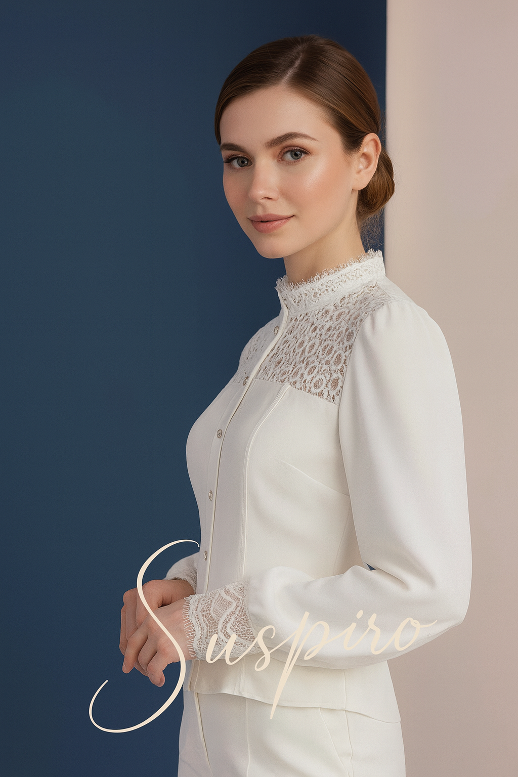 La blusa Suspiro es una pieza delicada y sofisticada, diseñada para mujeres que buscan elegancia en cada detalle. Confeccionada en un suave crepé blanco, combina líneas limpias con un toque romántico gracias a los paneles de encaje en la parte superior y los puños.