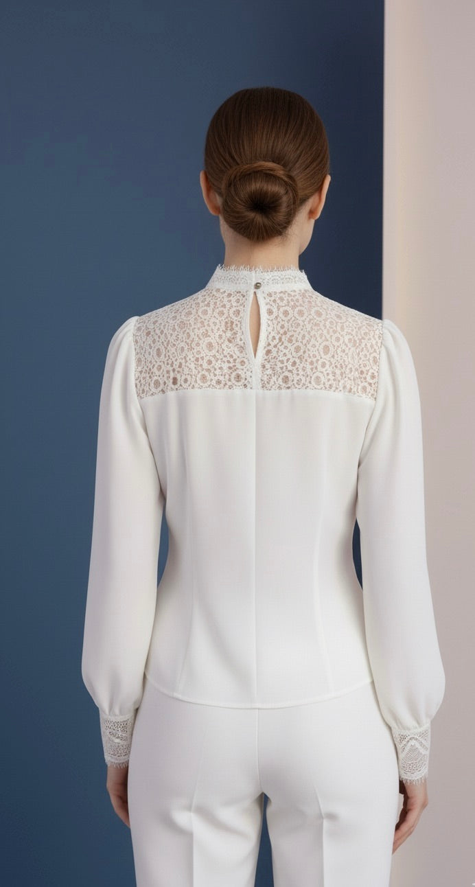 Su cuello alto con encaje, mangas largas ligeramente abullonadas y botones frontales aportan un estilo refinado y atemporal. Perfecta para ocasiones especiales, reuniones profesionales o un look de día elevado.